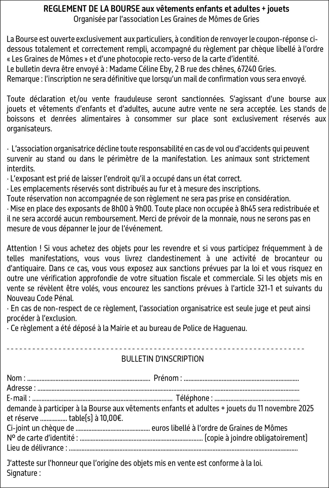 L’association Les Graines de Mômes vous invite à sa bourse annuelle dédiée aux vêtements, jouets et matériel de puériculture, le lundi 11 novembre 2025, à l’Espace La Forêt de Gries, de 9h00 à 13h00.
